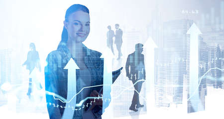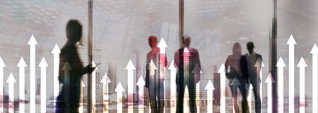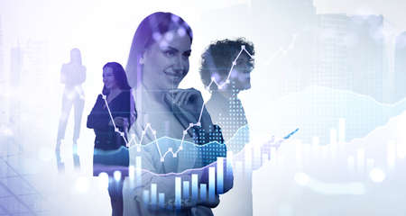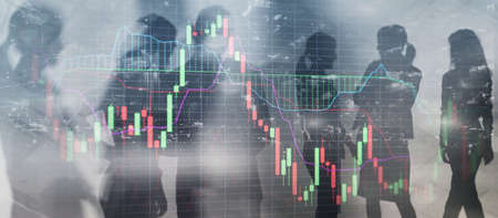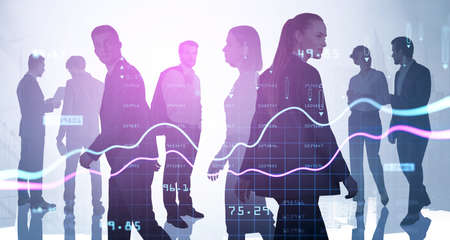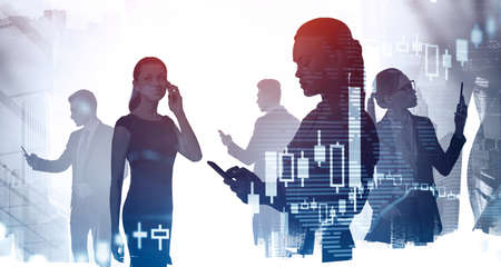 Silhouettes of businesswomen and businessmen working in blurry city. Toned image dobule exposure of graphs