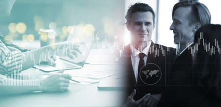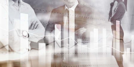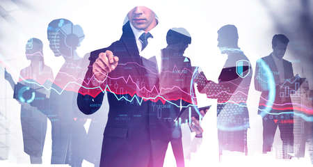 Businesspeople working together, CEO in front view discussing concept of analysts trying to predict stock market behavior. Double exposure