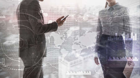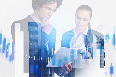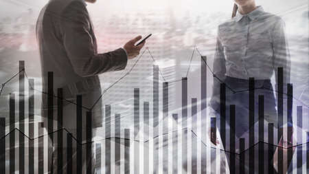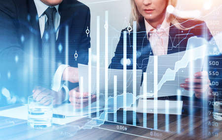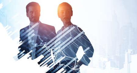 Businessman and businesswoman working together, double exposure of blurred graphs with lines, bar chart and city skyscrapers. Concept of online trading and partnership