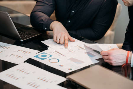 business documents review. man pointing at some important data with a finger. statistics papers analysis. investment rates discussion