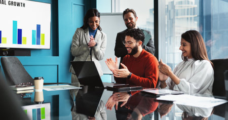 Laptop, applause or team of business people celebrate profit growth, performance data or goal achievement. Excited, finance or group in office with success, winning or investment target in hedge fund
