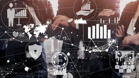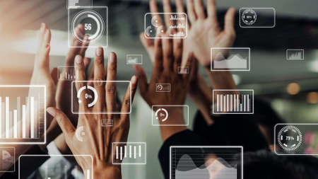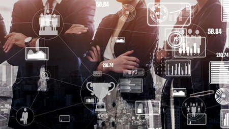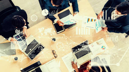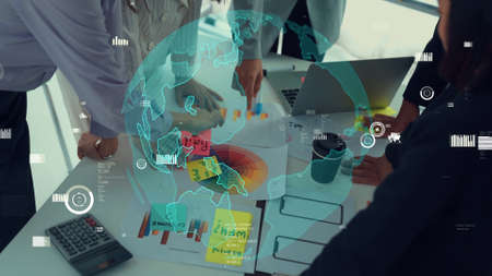 Creative visual of business people in corporate staff meeting . Concept of digital technology for marketing data analysis and investment decision making .