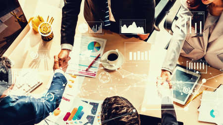Group business people handshake at meeting table in office together with confident shot from top view . Young businessman and businesswoman workers express agreement of investment deal. broaden view