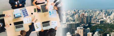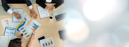 Business people group meeting shot from top widen view in office . Profession businesswomen, businessmen and office workers working in team conference with project planning document on meeting table .