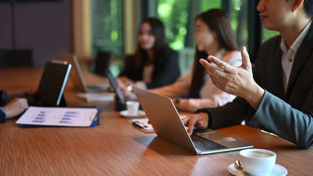 Cropped shot corporate executives discussing business strategy together in meeting room.
