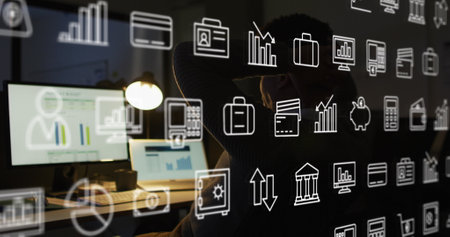 Image of data processing over biracial businessman working in office. Global business, finances, computing and data processing concept digitally generated image.