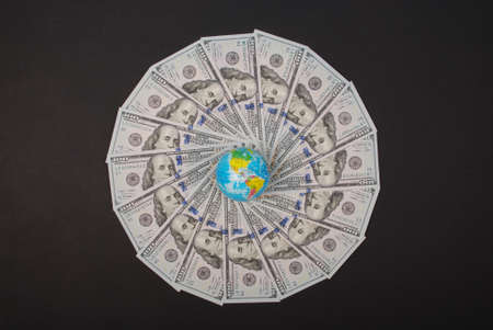 Earth globe on mandala kaleidoscope from money. Abstract money background raster pattern repeat mandala circle. On black background.