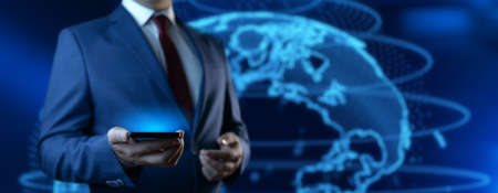 Man holding and using smartphone on digital background. Technology internet and business concept