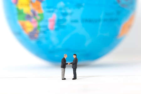 Miniature businessmen shaking hands on blurred global or world background. Concept of partnership. Business successful.