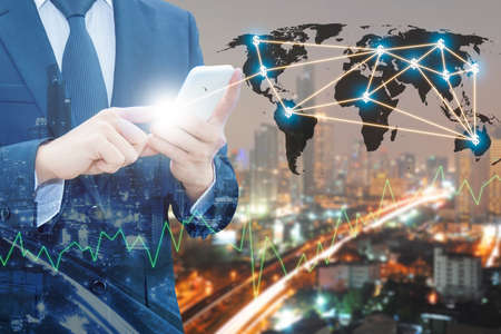 Double exposure of professional businessman using smart phone and night cityscape with blurred city centre of business and financial graph up, Technology & Business trading concept,