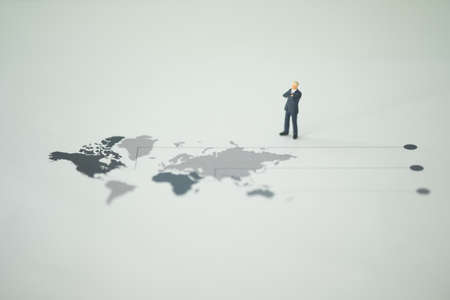 Miniature businessman leader in suit standing on map globe and looking goal achievement. Business economic global concept.