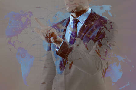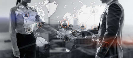 Global World Map Double Exposure Network. Telecommunication, International business Internet and technology concept.