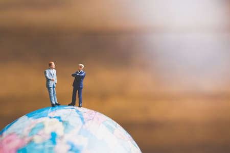 Miniature people business concept -Global trade partnership, with businessman, coin stack and globe
