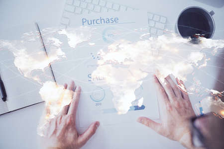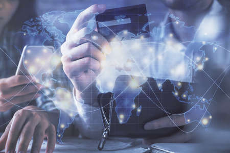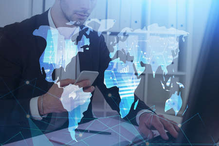 Double exposure of mans hands holding and using a phone and international business theme drawing.