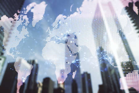 Multi exposure of abstract creative digital world map hologram on office buildings background, tourism and traveling concept