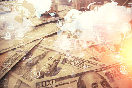 Multi exposure of social network drawing over us dollars bill background. Concept of people connection.
