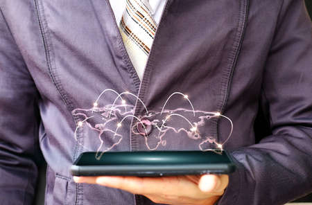 business man holding computer tablet with smoke and wolrd map in background