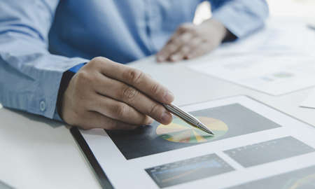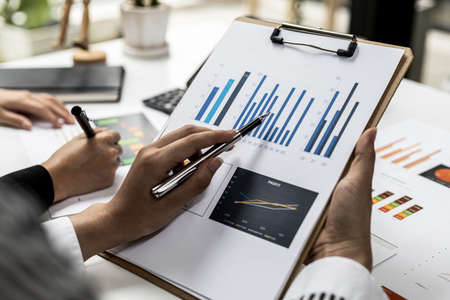 Businessmen are examining company financial information from documents prepared by the finance department, financial documents placed on their desks displayed in bar charts. Financial concept.