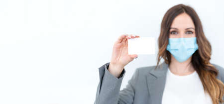 Business woman showing a blank credit card on a white background. She's wearing a face mask and formal wear. Selective focus. Space for text. Business and new normal concept.
