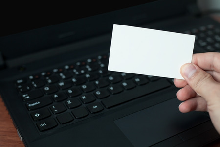 Man hand holding white business card, close-up, selective focus