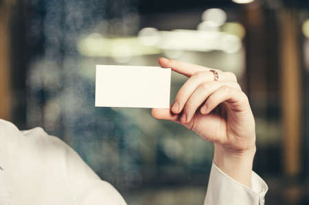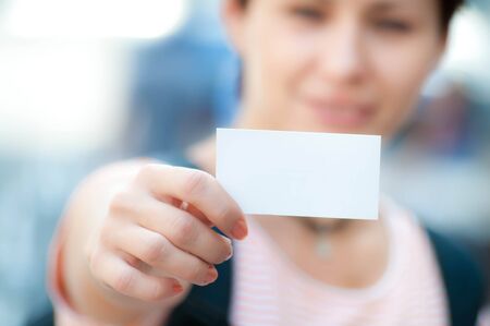 Female hand give blank calling card visitor closeup