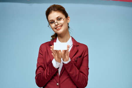 Business woman red jacket business card official glasses blue background