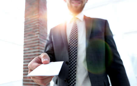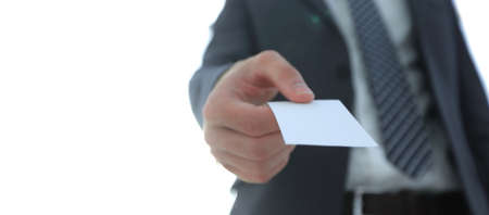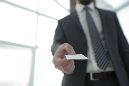 Businessman holding a blank business card. Close-up shot.
