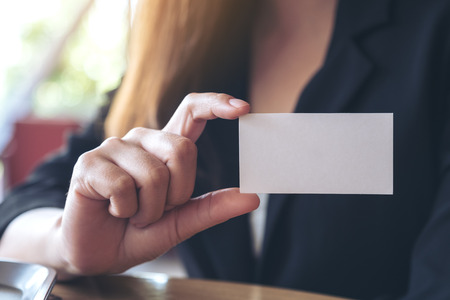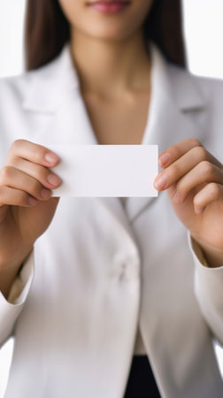 A businesswoman holding and showing an empty business card