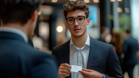 Detailed shot of a young businessman at a networking event, engaging in conversation and exchanging business cards, reflecting a dynamic professional interaction.