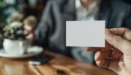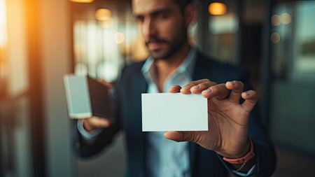A stylish businessman confidently holds a blank business card, offering a perfect mockup for branding and marketing materials. The blurred office background hints at a corporate setting, ideal for showcasing professional identity. This image is perfect for advertising, presentations, or any project requiring a clean and modern visual emphasizing contact information and communication. The businessman's hand and focused expression project success and build a sense of trust. Utilize this image with ample copy space on the business card to highlight your brand's message.