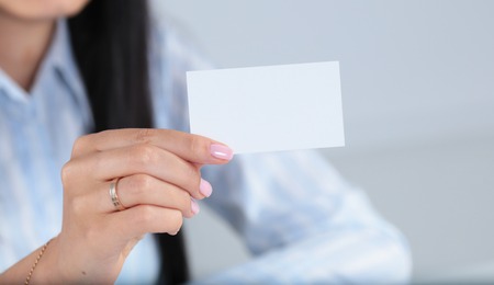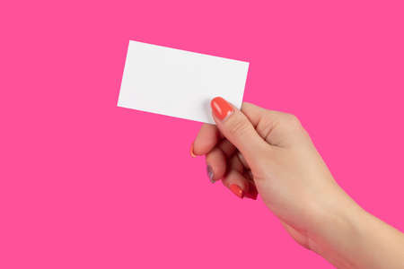 Female hand with neat manicure holding white empty blank business card.