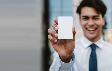 Business Card Mockup Image. Happy Young Businessman Presenting a White Blank Paper Card with Clipping Path