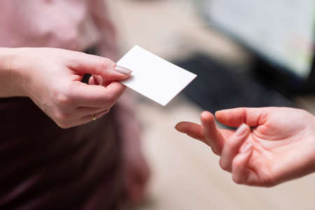 blank white card passed between hands. women exchange business cards, business meeting. Networking concept