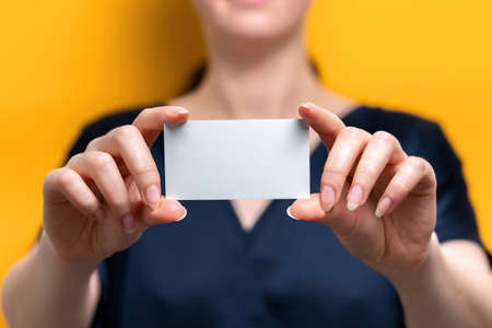 A blurred woman holds a blank white card. Close up. Yellow background. Mock up.