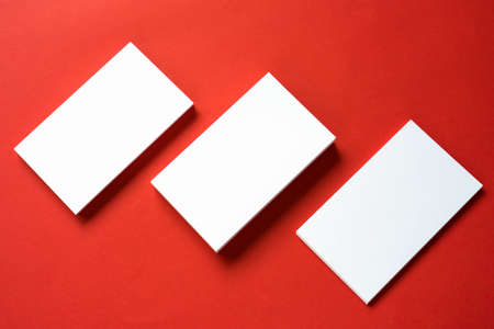 Blank kraft business cards on red paper background. Blank template for branding identity.