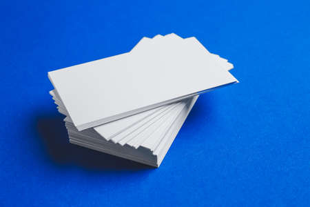 stack of rectangular white blank business cards on a blue background, backdrop for the designer