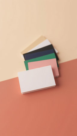 Mockup of a fanned stack of business cards on a white textured paper background, high-angle shot, minimalist style