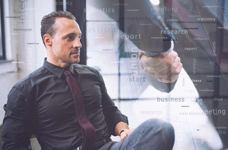 Confident businessman during a meeting. He watches far for future business vision. Handshake with partner in overlay