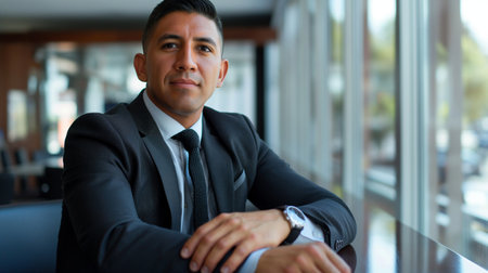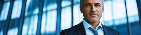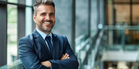a charismatic businessman exudes confidence. Dressed in an exquisite suit with a tie, blurred office background. The copyspace in the background offers a canvas for personalized messages or branding.