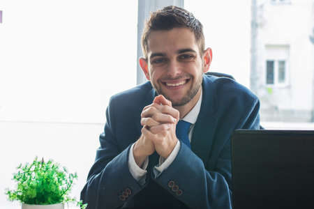 Young happy businessman in a suit indoors