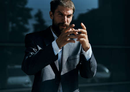 Business man in suit gestures with hand emotions outdoors lifestyle