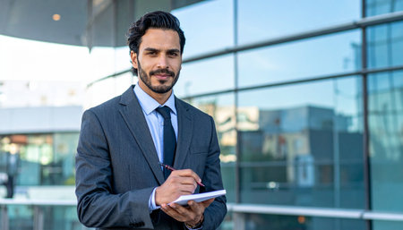 Portrait of handsome Indian businessman writing on clipboard in front of office building
