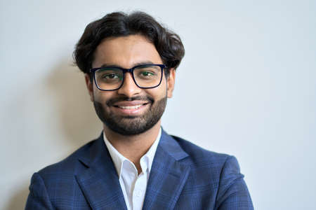 Happy young indian business man wearing suit and glasses. Headshot portrait
