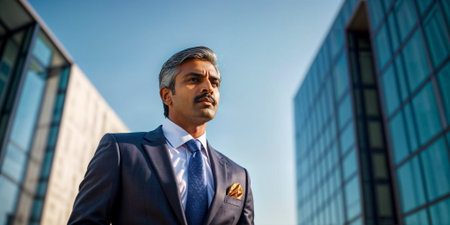 close-up of hindu man in a suit and tie, standing in front of a glass building, looking serious with a mustache.