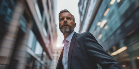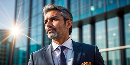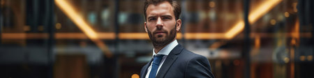 A confident man in a suit stands in front of a modern building, looking determined.