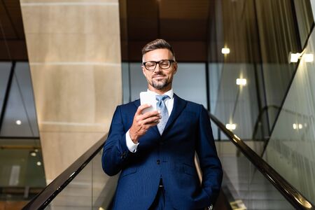 handsome businessman in suit and glasses using smartphone in hotel