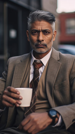Relaxing after hard working day Thoughtful mature man in formal wear holding coffee cup and looking away while sitting at the staircase : Generative AI