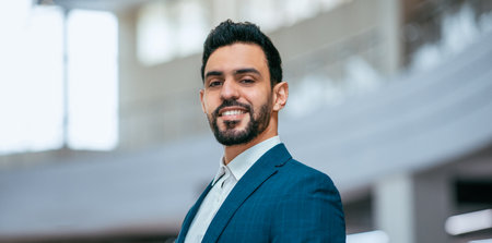 Portrait of Indian young businessman in suit smiling at camera while walking along the office corridor to the work
