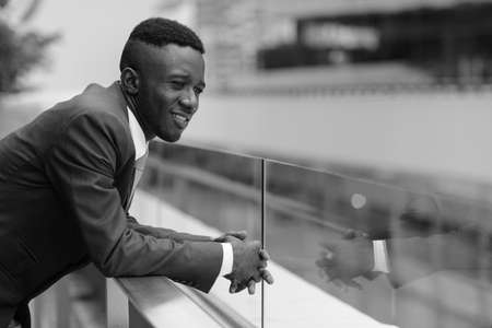 Young African businessman in the city outdoors in black and white