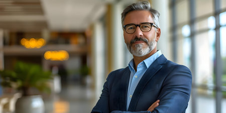 Portrait of a confident experienced executive in a corporate office setting. Concept Business Headshot, Professional Corporate Portrait, Executive Office Photoshoot, Leadership Image
